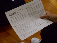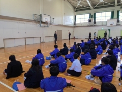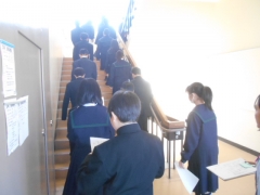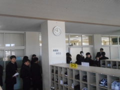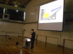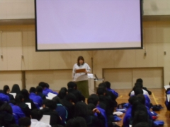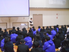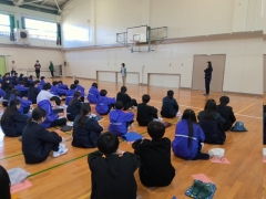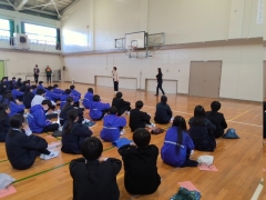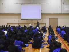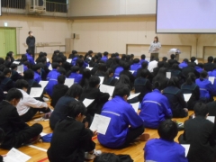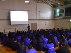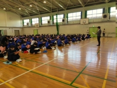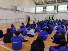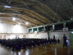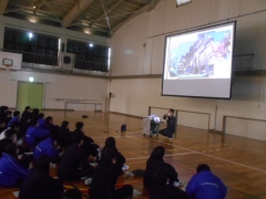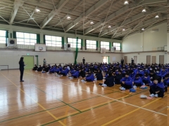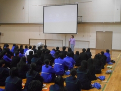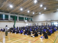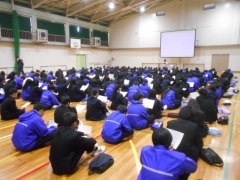 その後の学年集会では「常磐中学校の生活」について、生徒指導担当の先生から説明を聞きました。そして、常磐中の一日の生活のビデオ鑑賞を行いました。