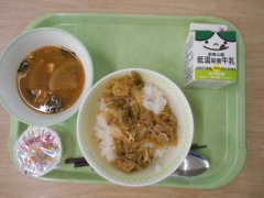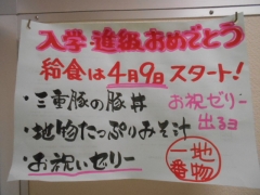 令和8年度の給食がスタートします。初日の献立は、三重豚の豚丼、地物たっぷりのみそ汁、お祝いゼリーの地産地消メニューでした。