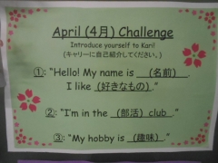 4月のEnglishboardは、キャリー先生の自己紹介を始め、アンケート「今年一番楽しみにしていることは?」、April Chalenge「キャリー先生に自己紹介をしよう!」、Englishクイズなど、お楽しみ企画が満載です。キャリー先生と一緒に英語を楽しみましょう!