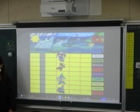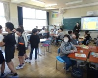授業はグループ対抗で、ゲーム形式で英会話を行いました。ポイント表示が人気ゲームのレースのようになっていたため、6年生の人たちは大きな声で英会話をしたり集中して先生の言葉を聴いたりしていました。