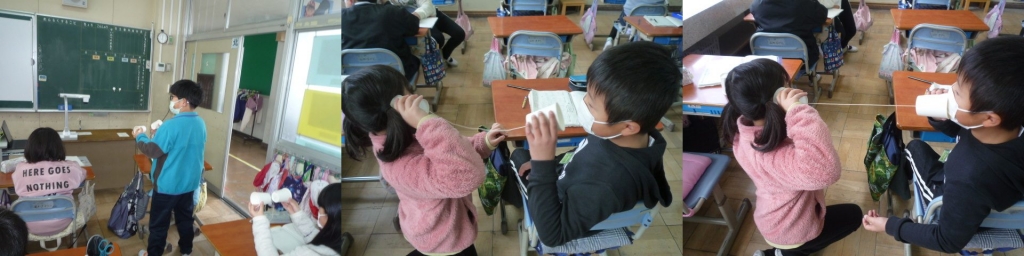 どうすると声が伝わるのか、考え合った後、ある子がひもに着目し、伸ばした時とたるませた時のちがいを説明し、伸ばした時の方が伝わりやすいと説明していました。