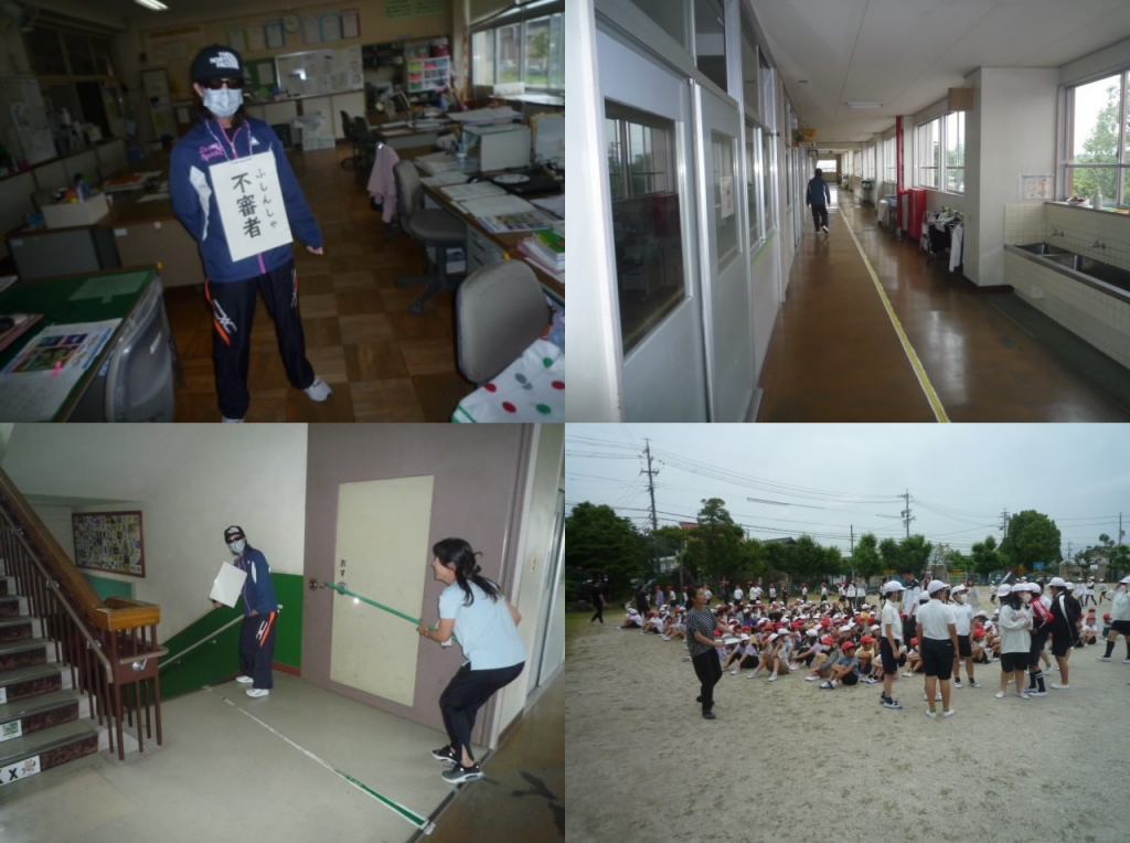 今日は、不審者役の本校職員が、ある学級に侵入し、子どもを切りつけようとするを回避しようとする訓練です。