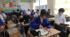 クラスの全員から“あなた”に向けて、メッセージを一枚の紙に寄せ書きした「合格守り」作りです。一人一分ずつ回していくと35人では1時間の授業がぎりぎりですが、なんとか書ききりました!一人ずつに思いをこめた言葉を選び、真剣に気持ちを書いていく時間。どのクラスもあたたかい雰囲気に包まれました。