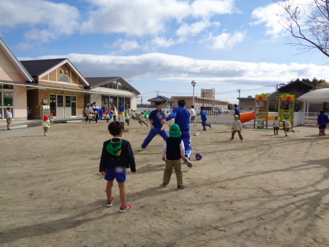 園児たちとサッカーする朝明っ子。結構真剣に戦ってます。