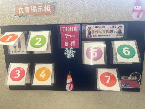おなじみの食育掲示板には、「学校給食7つの目標」が記されています。