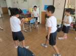 牛乳パックを使って、遊べるおもちゃ(パチンコとけん玉)を作りました。そのおもちゃを使って楽しめるルールを考え、お店の準備をしています。