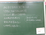 最後に、友達と仲良くするにはどうしたらいいか考え、「できない子がいたら、できるところまでがんばろうって言う」「いっしょに楽しいことをする」「人の気もちを考える」などたくさんの意見が出ました。「あやまりたいけどあやまれないときがある」と、自分のことを見つめる姿もとっても素敵でした。