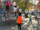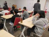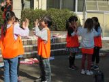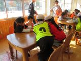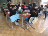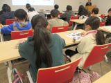 4年生の外国語活動では、野菜や果物の絵カードを使い、英語指導員の後に続いて野菜と果物の名前の練習をしていました。その後は、頭に手を置いて・・・「野菜・果物キーワードゲーム」が始まりました。英語指導員の問題をよく聞いて、聞こえた野菜や果物を指さします。ゲームは大盛り上がり。どの子もよく聞こうと集中し、教科書の絵をしっかり見ています。英語指導員来校日には、給食を一緒に食べる学年があります。いろいろな場面で積極的にコミュニケーションがとれることを期待しています。
