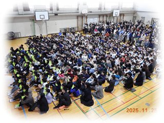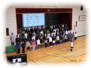 雨のため、運動場で行うはずの大合唱を体育館で行いましたが、世代を超えて集まった人たちの歌声が体育館いっぱいに響き、まさに奇跡の共有体験となりました。