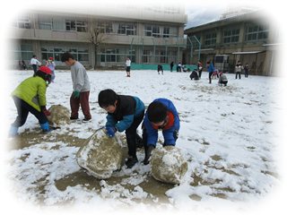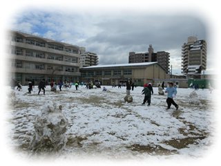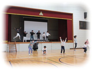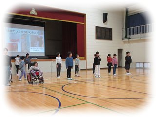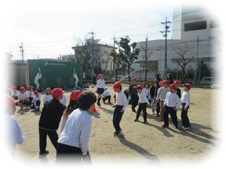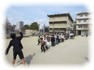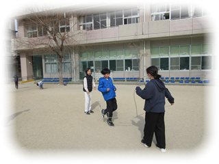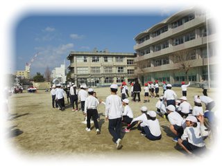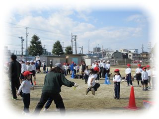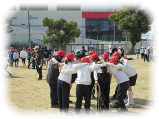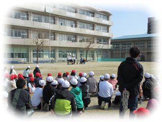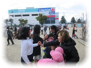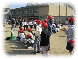昨日の学校到着時、ちょうど全校児童の大なわチャレンジが行われていたので、まずは園児たちはそちらを見学。すごいスピードで八の字跳びをする様子に驚いていました。