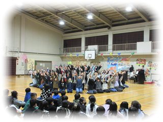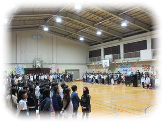 スライドが終わって再び明るくなったフロアいっぱいに並ぶ5年生。
