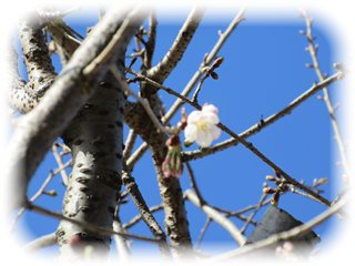 その桜が、今朝はもう一輪開いて、二輪が仲良く並んでいました。