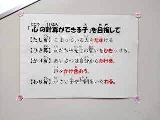 めざす子どもの姿に、「心の計算ができる子」を追加しました。子どもたちには目標のバージョンアップと始業式の時に話をしました。校舎のいろいろなところに、掲示して、この1年間忘れない目標にしたいと思っています。
