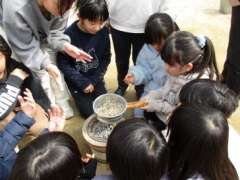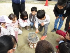 七輪に炭をおこしたところで、あられを煎り器を使って何回か振ってみました。あられが少しづつ膨らんでいい匂いがしてくることを体感しました。出来上がりをみんなで分けて食べて、「おいしい」「あったかい」と笑顔いっぱいでした。「今日はみんなでやったけどこれを一人でやったら大変だな。」と「今はお菓子は買ってくるから簡単だけど、自分たちで作ると大変だ」と昔の暮らしと自分たちの暮らしを比べて考えることができていました。