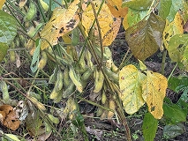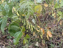 この植物はダイズ(大豆)と思われます。ダイズは東アジア原産のツルマメが原種と考えられています。農作物として世界中で広く栽培されています。収穫期時期は10~11月頃のようです。ダイズは色々な形で利用されています。発芽させたモヤシ、未完塾の枝豆、完熟した大豆、大豆を搾ると大豆油、加工して醤油、きな粉、味噌、納豆、豆乳、豆腐などいろいろな身近な食材になっています。日本では古くからダイズを利用してきたと考えられていて、縄文時代に存在したと思われる世界最古の大豆の出土例があるようです。