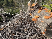 このきのこはヒイロタケ(緋色茸)と思われます。子実体は扁平な傘型で固く、基部で材にしっかりと固着しています。全体が鮮やかな緋色(やや黄色みのある鮮やかな赤)から朱紅色のキノコです。傘は半円形から円形、幅は3~10cmです。 風雨にさらされると表面の鮮やかな色は退色し、灰色となるようです。直射日光にさらされた場所の材木でも旺盛に生育します。広葉樹(まれに針葉樹)の枯木に発生します。日本国内では平地に広く見られます。