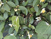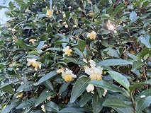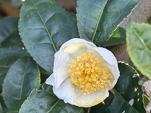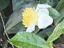この花はチャノキ(茶の木)と思われます。原産地はインド、ベトナム、中国西南部と考えられています。花期は10~ 12月で、白い5花弁の花が咲きます。また多数の雄しべが突き出し、微香があります。花芽は夏頃に見られ、丸くて柄があり、ほぼ下向きにつきます。葉は枝に互生すしています。葉は長楕円状披針形で、縁には細かくて背の低い鋸歯が並びます。