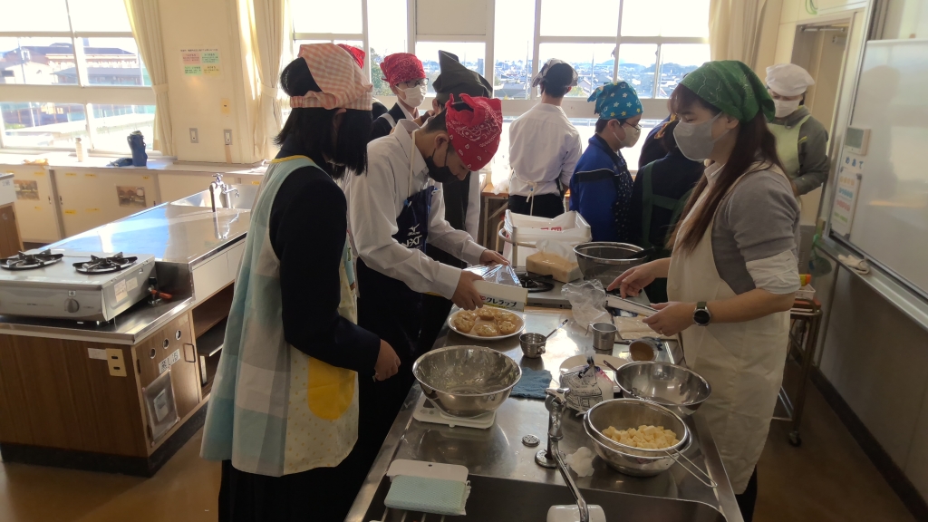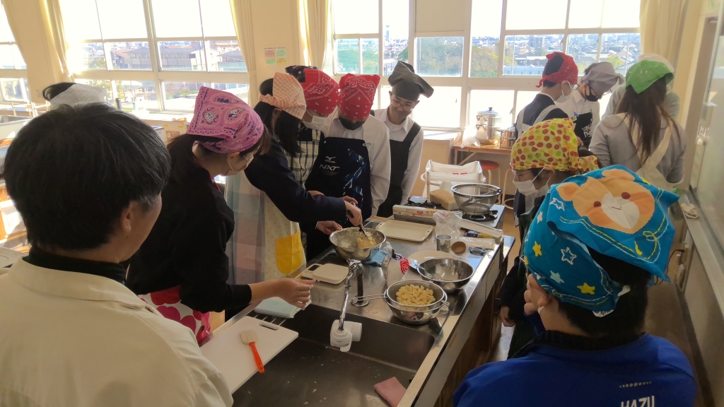 AB組で育てたサツマイモを使って、カップケーキを作りました。分量を量ったり、火が通っているか確認したり、協力して作業する姿がありました。
