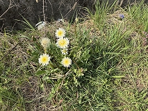 頭花(花に見える部分全体)のサイズは直径3.5 ~4.5cmほどになります。白く見える部分は舌状花(頭花を作る1つ1つの小さな花)で、中央の花柱部は黄色です。土手、空き地などの日当たりのよい草地に生息します。