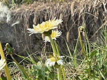 この花はシロバナタンポポ(白花蒲公英)と思われます。日本在来種です。2~5月にかけて白い花をつけます。