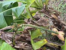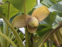 この花はバショウ(芭蕉)と思われます。高さは約4m、長さ2~ 3 mの長楕円形の葉をつけます。葉身は側脈に沿って裂けていることが多いです。花期は5月下旬~11月にかけてです。