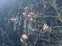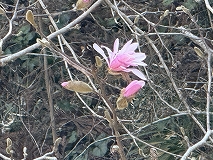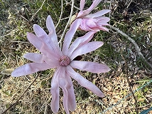 この花はシデコブシ(四手辛夷)と思われます。花期は3~4月で葉が展開する前に多数の花被片をもつ直径7~10 cmの大きな花が咲きます。花色は白色から淡紅色があります。日本の東海地方の一部の湿地に固有の種ですが、庭木などとして栽培されています。日本では、環境省のレッドリストにおいて準絶滅危惧の指定を受けています。三重県でも四日市市や菰野町の一部でしか見ることができないようです。