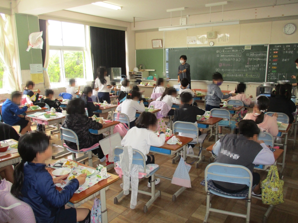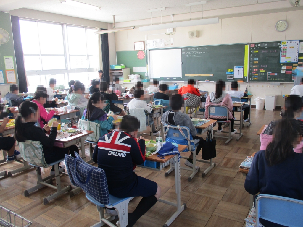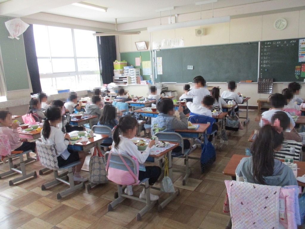 本来なら「おいしいね!」や「カレー大好き!」など、子どもたちのうれしそうな声が聞こえてくるところですが、どの学級も写真のように全員が前向きで黙々と給食を食べているので教室はとっても静かです。でも、子どもたちの表情から、おいしくカレーを食べている様子がうかがえました。