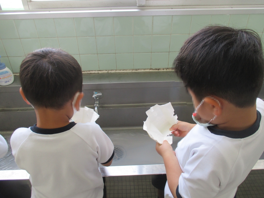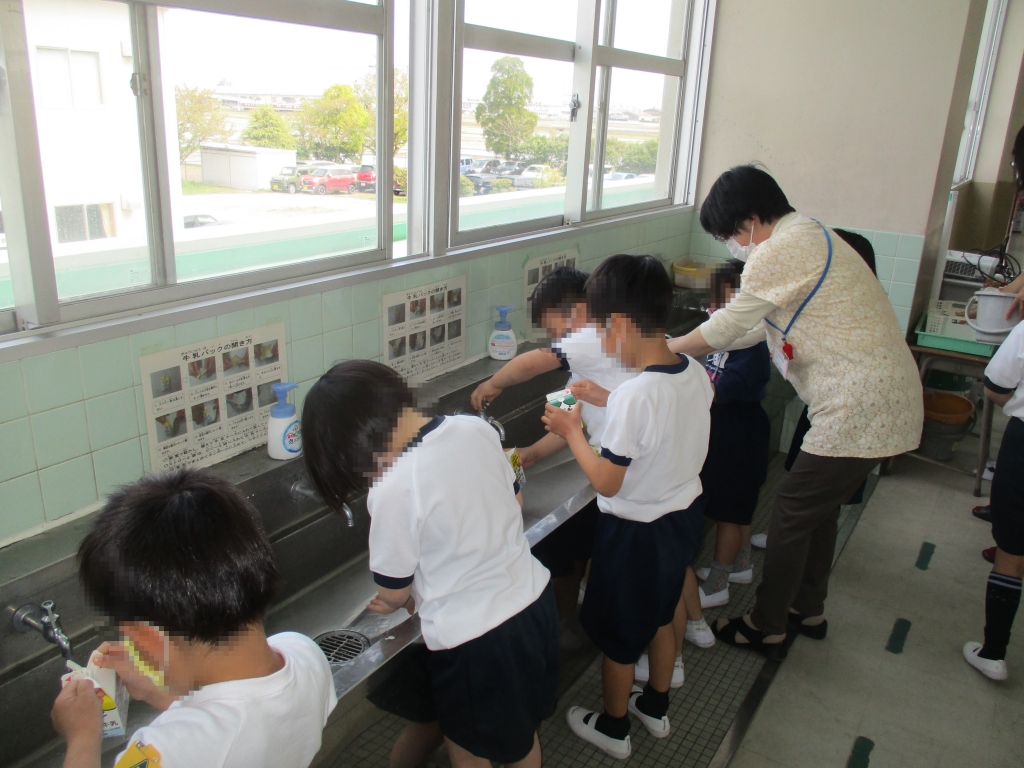そして、1年生は牛乳パックの片づけ(飲み干した後の牛乳パックを開いて洗います)に悪戦苦闘。こちらも本来なら6年生の子どもたちが教えに来てくれていたのですが、感染防止のため先生に開き方を教えてもらっています。