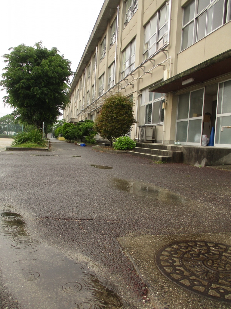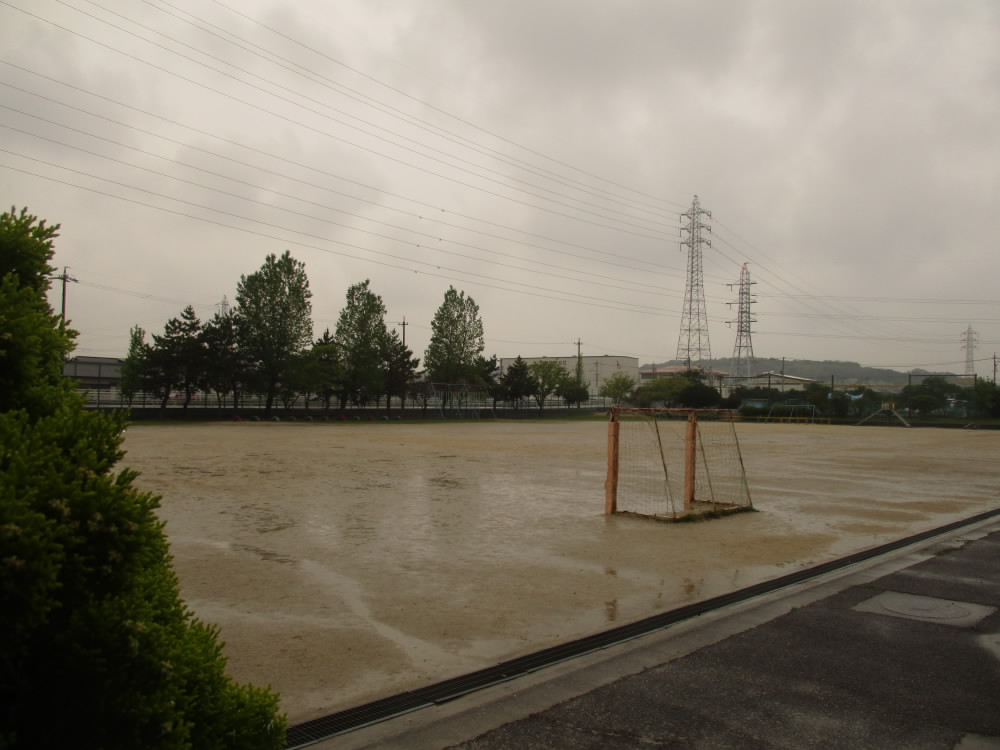 今日は、しとしと雨模様。残念ながら外では遊べず、いつもは子どもたちの元気な姿でにぎわう運動場もご覧のとおり寂しい雰囲気です。