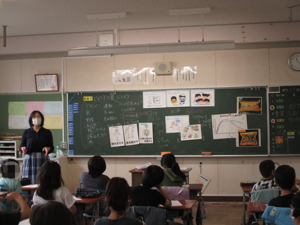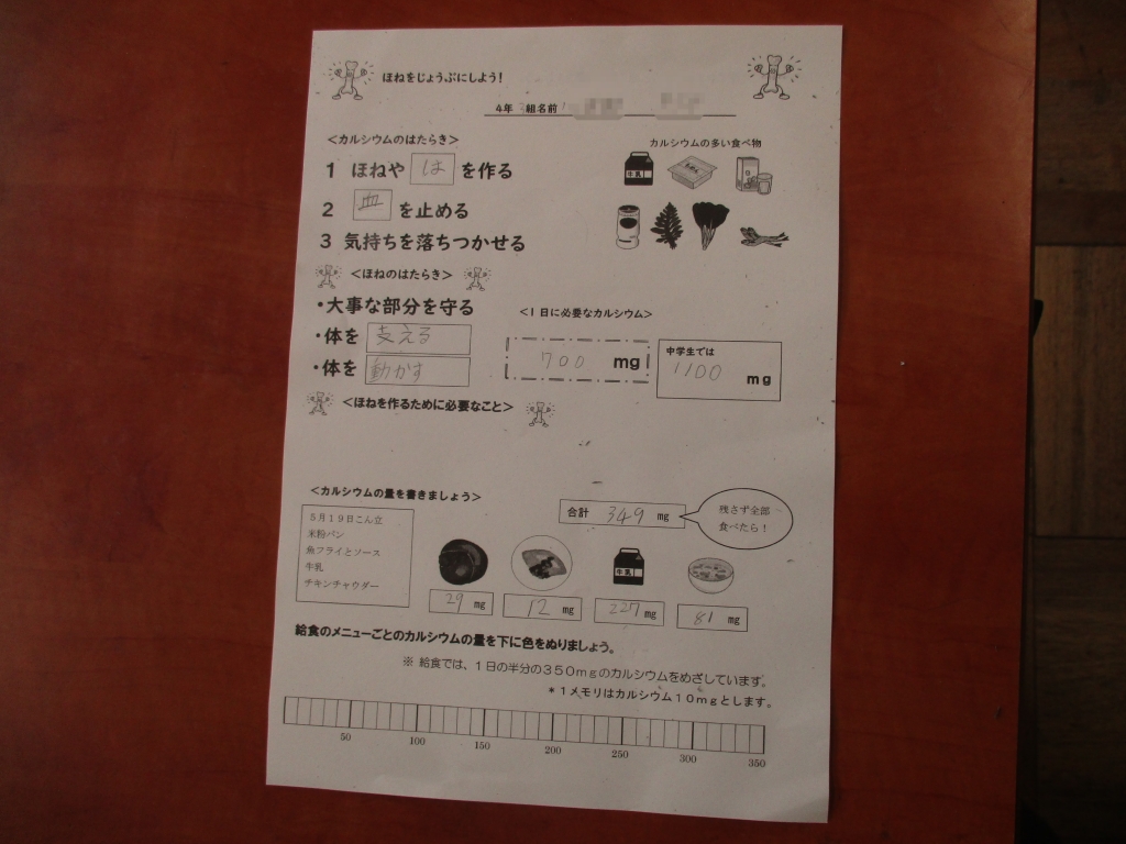 骨を成長させ、強くするには「カルシウム」という栄養が大切であること、そして、しっかり体を動かすこと、しっかり睡眠をとることも重要ということを教えてもらいました。小学生の子どもたちには1日約700mgのカルシウムが必要だそうです。学校の給食では約350㎎を目安に献立を考えてもらっているそうです。子どもたちは「給食減らしたら足りなくなる」「お代わりすればしっかりとれる」など口々につぶやいていました。