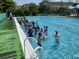 梅雨の中やすみ。今日も朝から暑い日になりました。そんな暑い中、1年生の子どもたちは気持ちよさそうにプールで「水遊び」を楽しんでいました。「水遊び」と言っても体育の授業です。低学年の体育における水泳指導は、学習指導要領では「水遊び」として扱われています。水の中を歩いたり走ったりして移動することや、息を止めたり吐いたりしながら水にもぐったり浮いたりすることなどがその内容です。