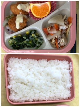 メニューは鶏肉のスパイシー揚げ、白菜のゆかりあえ、大根煮、コーンサラダ、みかんでした。