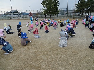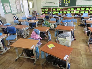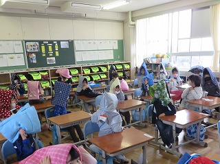 17日には、ぜんこういっせいのひなんくんれんをしました。こんかいは、じしんのそうていで、げんさいずきんをかぶりました。いすからうまくとれなかったり、かぶるむきがわからなかったり、れんしゅうしておくことはとてもたいせつだとかんじることができました。