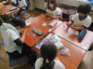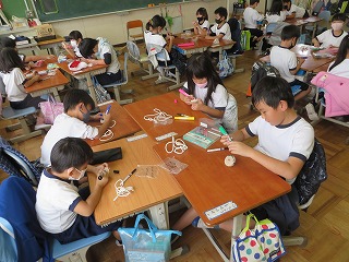 生かつかでは、むかしのあそびの学しゅうがはじまりました。まずはコマまわしです。はじめに、じぶんのコマにおきにいりのいろでもようをかきました。休みじかんにもがんばってれんしゅうしています。