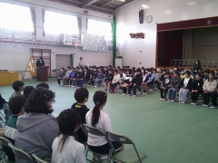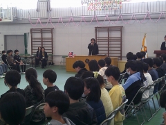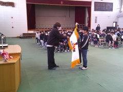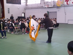 本日、5年生と6年生が参加して交通少年団の入退団式を行いました。 これまで1年間、毎朝の登校を安全に見守ってきた6年生から、活動の象徴である団旗が5年生へと引き継がれました。