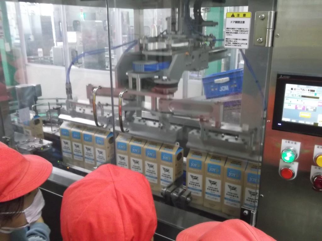 茶業振興センターでは、茶葉が作られるまでの工程を実際に工場に入り見せていただきました。四日市酪農では、牛乳が保管されている大きな冷蔵庫に入ったり、牛乳が機械で運ばれている様子を見たりしました。