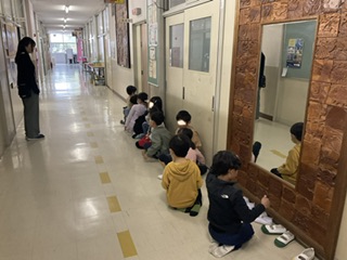 今日は1年3組が放送室で聴力検査をしていました。「音が聞こえたら手を挙げるよ」という指示をしっかり聞いて、2人ずつ検査を受けていました。廊下で待つ子どもたちも黙って静かに待つことができていました。そのあと、1年3組の教室の前を通ると、どの子の机の上にも物が一切乗っておらず、整然とした教室の様子がみられました。