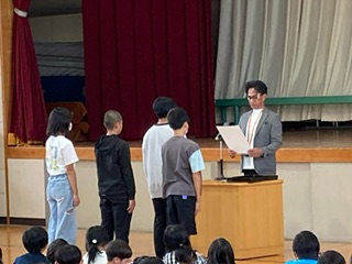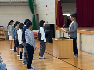 後期代表委員会、学級委員、各委員会委員長の認証の後、三泗小学校科学展、社会科展、読書感想文、そして、先日開催された三泗陸上記録会の入賞者の表彰を行いました。