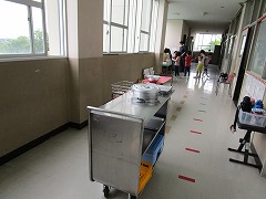 今までは班の形になって食べることが多かったのですが、今は全員前向きで机を離したまま食べています。教室いっぱいを使っていますので、配膳や後片付けは黒板前の空いたスペースや廊下を使って空間を確保しています。