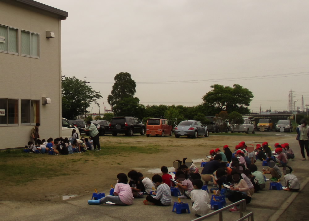 降り始める前に1年生のみんなが何やら観察していました。よく見ると、先日撒いたアサガオが芽を出したようです。葉の枚数や大きさなどじっくりと観察して観察カードにまとめていました。