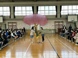 練習後には各学年の代表児童による校旗の受け渡しがありました。6年生から後輩たちへメッセージと共に校旗を受け渡しました。5年生には、今年度の6年生のように、来年度の羽津北小をしっかりと引っ張っていってくれるリーダーとして頑張ってほしいと思います。
