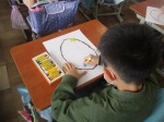 これは、図工の「不思議なたまご」の一場面です。思いついた模様をクレパスでどんどん描いていきました。画用紙の白い部分が見えないように頑張ってぬっていました。