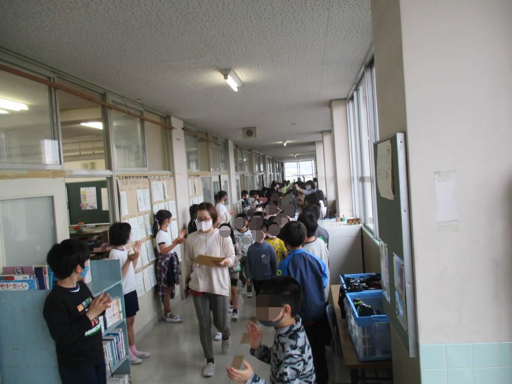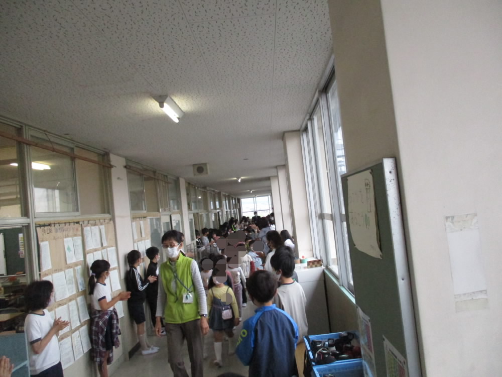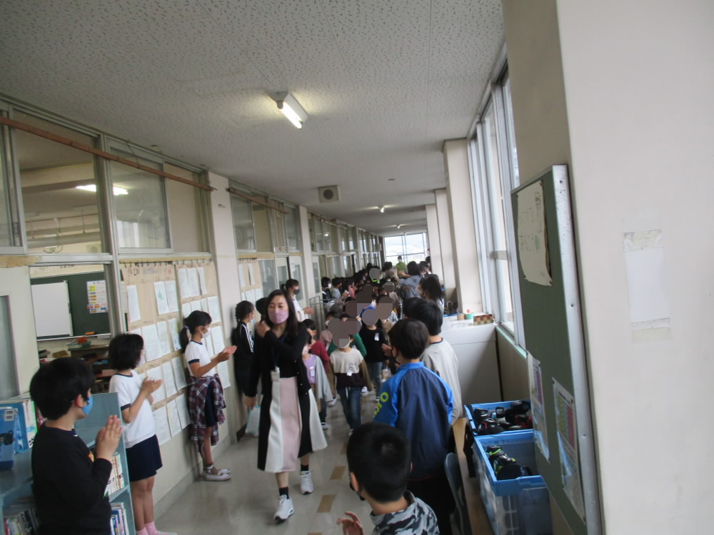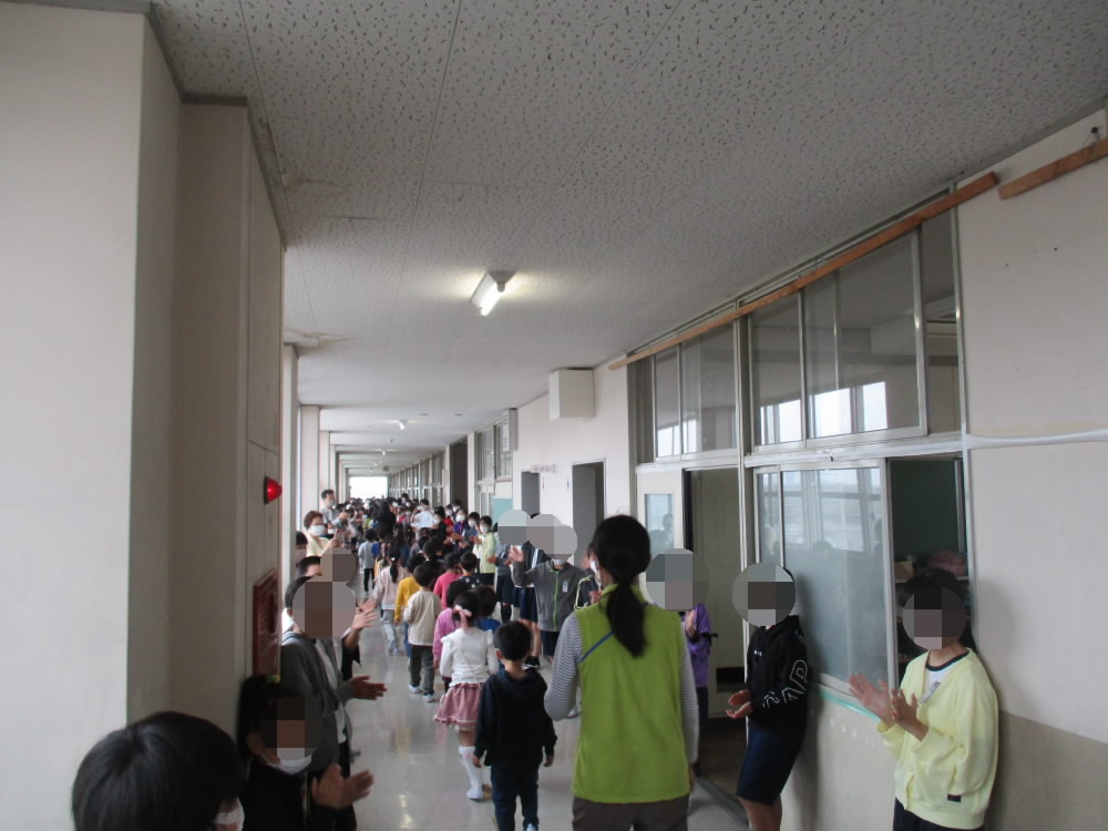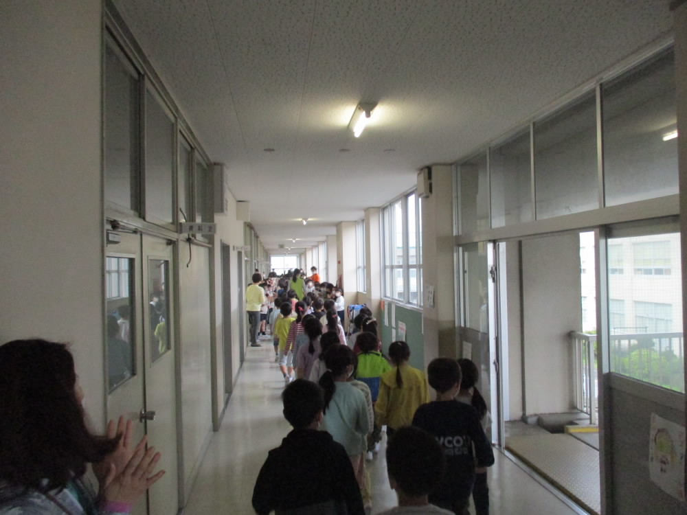 1年生が「さんぽ」のリズムに乗って各教室前の廊下をねり歩き、2年生から6年生までのみんなが歓迎するという形で行いました。