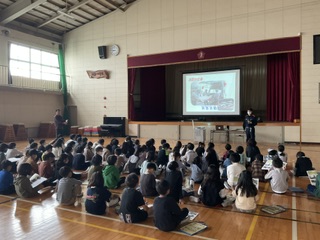 今日は、3年生が四日市北消防署の署員の方々をゲストティーチャーにお迎えして、防火教室を開催しました。