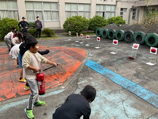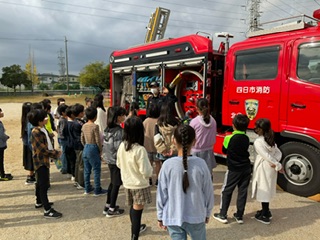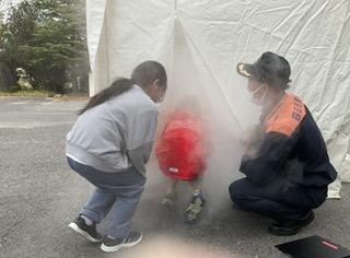 火事が起こった時や発見した時にはどうするとよいのかなどをお話していただき、フライパンの発火実験を見たあと、けむり体験、消火器体験をしました。今日は、本物の消防車も羽津北小に来てくれて、間近で実際に見ることもできました。