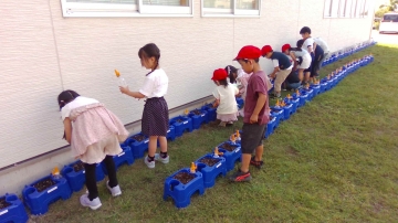 児童玄関前の植木鉢に、毎朝水やりをします。