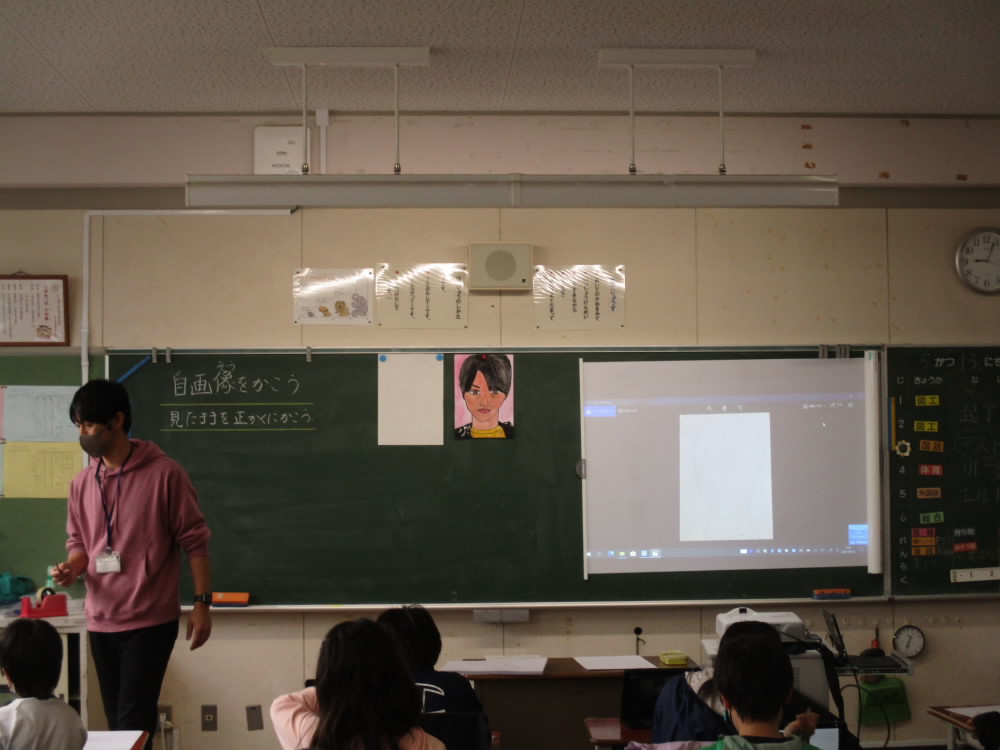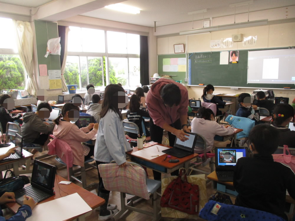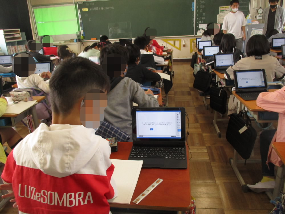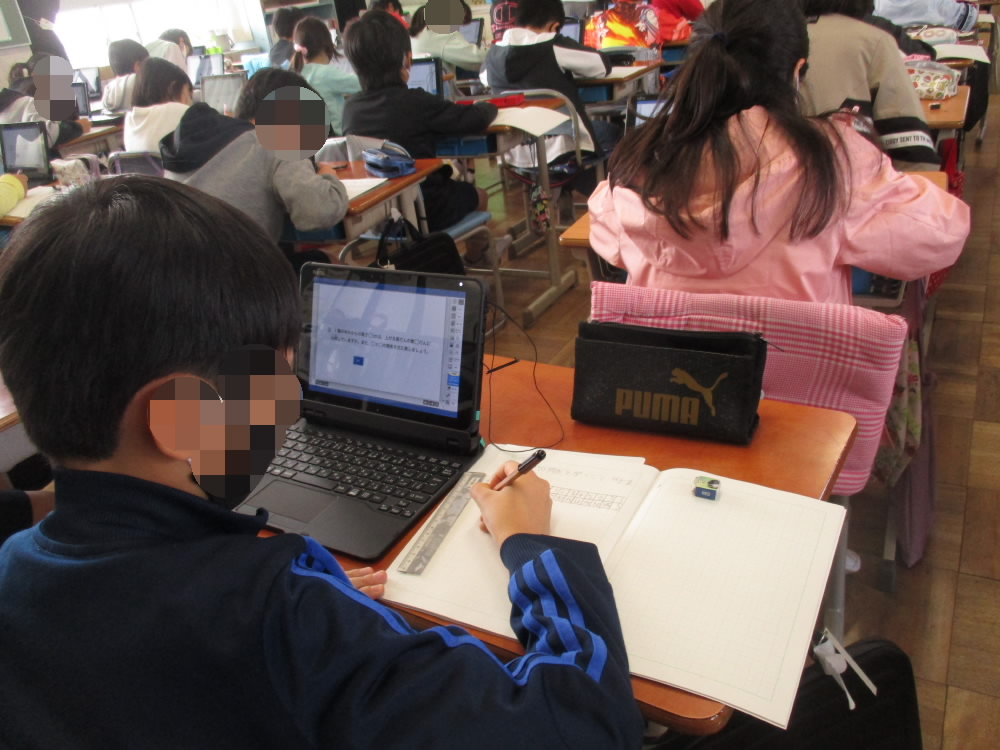 今日は、1時間目から4年生と5年生がタブレットを活用した授業が進められていました。4年生は、図工の時間に「自画像を描こう」という単元で、5年生では、算数で単元のしあげの問題にチャレンジするのに活用されていました。