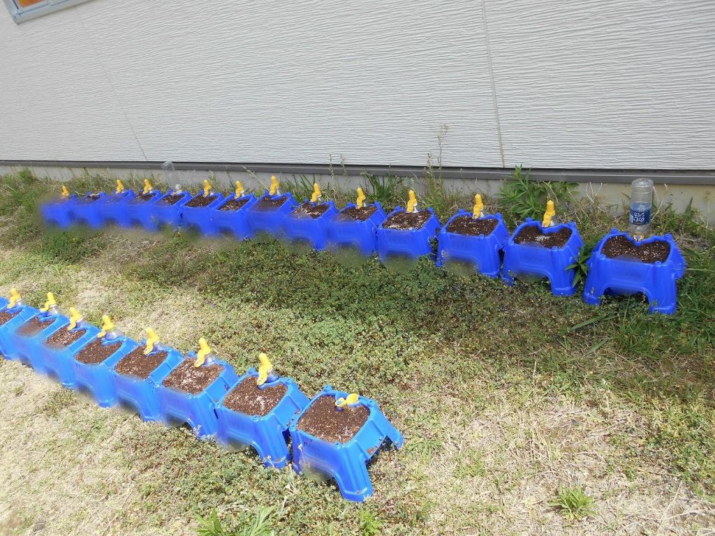 最後に水やり用のキャップを付けたペットボトルで、水をあげました。いつ芽が出てくるかな。