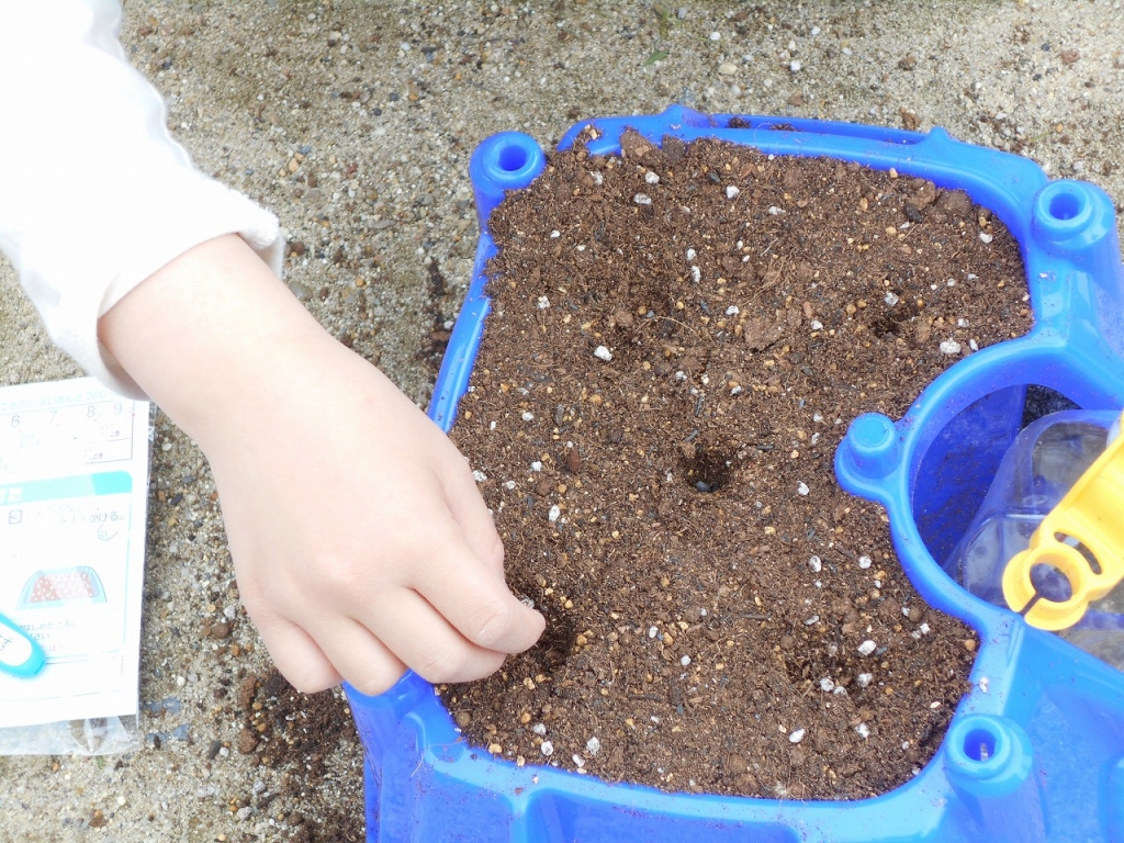 種を5つまきました。その上から元肥をまきました。「雪みたい!」「お米みたい!」という声が聞こえました。