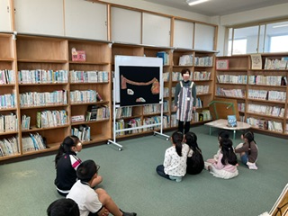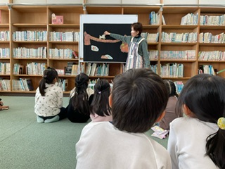 いつもお世話になっている図書館司書の先生にパネルシアターを開いていただきました。大きな紙芝居のような台紙の上で、登場人物を動かしながらお話をしてもらいます。